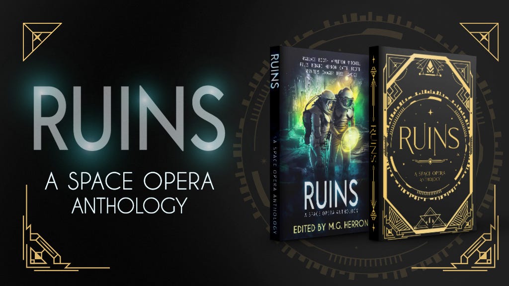 In the meantime, I highly recommend that you pop over to MGherron.com/ruins (Ruins-A Space Opera Anthology) and sign up for updates to the Kickstarter campaign, because there are some really nice extras there depending on the tier you choose to support and an absolute GORGEOUS HARDCOVER coming in addition to the Ebook, and paperback tiers. You DO NOT want to miss out on this if you’re a space opera fan, and/or a fan of xenoarcheology stories and exploring dead alien civilizations…or even some that are (to quote a famous miracle worker) only mostly dead!